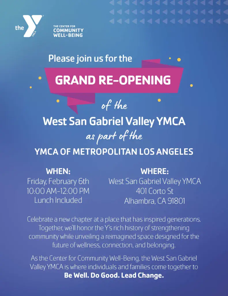 As the Center for Community Well-Being, the YMCA of the West San Gabriel Valley is where individuals and families come together to Be Well. Do Good. Lead Change.